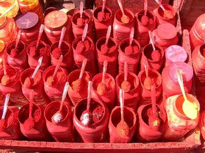 Rotes Farbpulver am Kali-Tempel in Kalkutta