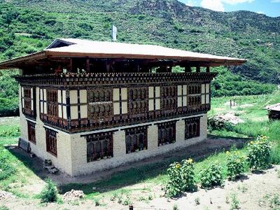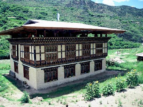 Typisches Haus im Stil bhutanischer Architektur