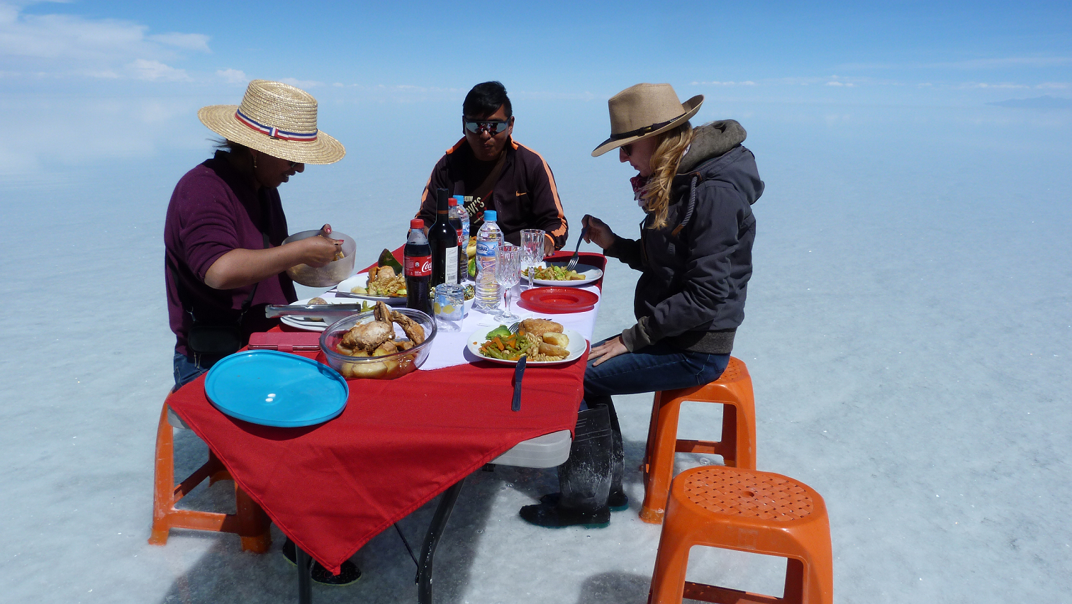 Rundreise Bolivien, Mittagessen, Uyuni, Salzwüste, EssenLiebe geht bekanntlich durch den Magen - daher finden wir, dass gerade das Probieren der lokalen Esskultur zu einem authentischen Reiseerlebnis dazugehört. Deshalb habt ihr die individuelle und kulinarische Freiheit selbst zu entscheiden, wann, wo und wie ihr essen möchtet. Die Reisebegleitung gibt euch gerne Tipps für Restaurants und besondere Spezialitäten der Landesküche. Damit ihr gestärkt in den Tag starten könnt, haben wir das Frühstück (außer nach der Nachtbusfahrt) in unsere Leistungen und den Reisepreis inkludiert. Auch die Mahlzeiten während unserer zweitägigen Jeeptour sind im Preis inbegriffen.