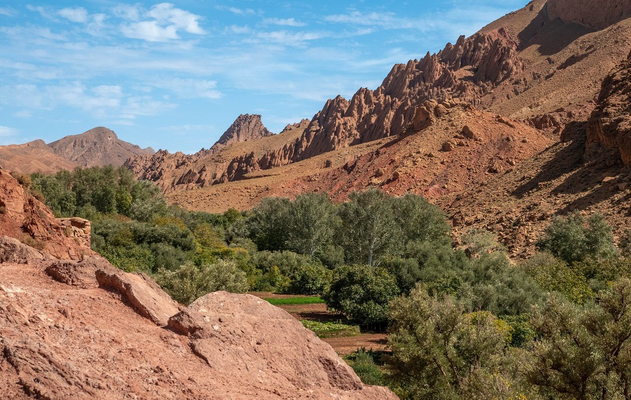 Früh am Morgen geht es weiter durch die malerische Landschaft in Richtung Dadès-Schlucht, mit einem Zwischenstopp an der imposanten Todra-Schlucht in Tinghir. Obwohl die Umgebung größtenteils karg und trocken ist, entdecken wir in der Dadès-Schlucht eine grüne Oase mit Palmenhainen und plätschernden Bächen. Hier kann man wunderbar wandern, entweder auf eigene Faust oder mit einem Guide. Wenn die Füße eine Pause brauchen, laden zahlreiche Teehäuser in den typischen Lehmhäusern der Region zum Verweilen ein. Mit einer Tasse frischen marokkanischen Minztees und der zeitlosen Landschaft um euch herum ist dies der perfekte Ort zum Entspannen.