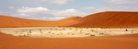 Mitten in der Namib Wüste zwischen Swakopmund und Lüderitz liegt das landschaftliche Highlight Namibias – das Sossusvlei. Die Lehmsenke ist von den mächtigsten Sanddünen der Welt umschlossen. Bis zu 300 m hoch werden sie. Ihre Farben variieren je nach Tageszeit und Sonnenlicht von blassem Gelb bis zu leuchtendem Orange und Rot. Der mühsame Aufstieg auf die Dünen wird mit einem atemberaubenden Ausblick belohnt.